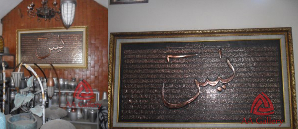 Kaligrafi Surat Yasin sangat banyak sekali bentuknya. Kaligrafi Surat Yasin ada yang berupa cetakan surat Yasin kemudian dimasukkan pada frame kaca. Kaligrafi Surat Yasin ada pula yang dibuat pada lempengan logam kuningan atau logam tembaga. Kaligrafi Surat Yasin yang dibuat pada logam kuningan dan tembaga umumnya dibuat seperti relief jadi timbul pada lempeng kuningan atau tembaga. Cukup banyak diketahui publik bahwa sangat mudah sekali buat menemukan tempat Perajin kerajinan tembaga dan kuningan yang terkenal adalah Pengrajin Kaligrafi Surat Yasin. Apalagi semenjak teknologi internet berkembang begitu cepat juga tidak bisa dibendung, siapa saja tentu cukup mudah menemukan tempat juga alamat Pengrajin Kaligrafi Surat Yasin. yang terkenal adalah Pengrajin Kaligrafi Surat Yasin AA Gallery yang berada di Cepogo-Boyolali . CV. AA Gallery memang hanya menerima berbagai seni dari bahan tembaga dan kuningan saja, termasuk Kaligrafi Surat Yasin tersebut. Alamat Pengrajin Kaligrafi Surat Yasin di Tumang Kupo, RT.01/RW.03, Dusun II, Dukuh Kupo, Cepogo, Kabupaten Boyolali. Jika Anda tertarik untuk membeli Kaligrafi Surat Yasin silakan hubungi nomor telepon kami.